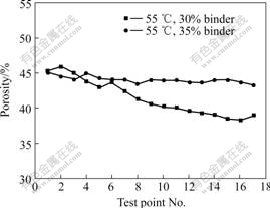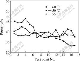 图4所示为添加电解Cu粉,粘结剂添加量为35%(体积分数)的混合粉末,在55、60和65℃时所成形的骨架960 ℃烧结后孔隙度的变化。从图4可知,55和60 ℃成形的骨架孔隙度曲线变化都较平滑,孔隙分布均匀。而50 ℃曲线变化较大,测试点1的孔隙度偏大是由于压制温度较低,导致混合粉末流动性能不佳,混合粉末无法完整填充模腔,致使压坯在杯口(测试点1)附近残留有宏观孔隙。而在杯底位置(测试点17),粉末无法流动,在压力作用下被压实,导致测试点17的孔隙度较小。