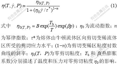 由于粉末颗粒的流动性能有限,混合粉末的流动行为的变化主要随粘结剂的流变行为而变化。Cross-Arrhenius粘度模型可以解释在不同温度下,粘结剂的粘度变化规律。Cross粘度模型中聚合物粘度为温度、剪切速率的函数,并考虑了压力对粘度的影响。