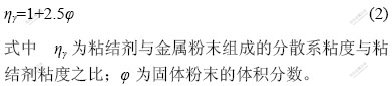 由式(2)可以看出,在粘结剂含量升高以后,粉末所占的体积减小,即φ变小,ηγ也相应减小。温度一定时,粘结剂的粘度是一定的,则混合粉末这个分散系的粘度也随着ηγ减小而减小。所以粘结剂含量较高的混合粉末的粘度较小,在较低温度下即可表现出较好的流动性能,能成形孔隙度小和孔隙分布均匀的压坯。