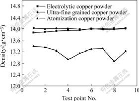 图9 添加不同类型Cu粉的骨架熔渗后样品的密度分布
