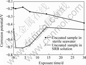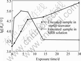 From Figs.1 and 2, we see that the corrosion potential of uncoated sample in the SRB solution is much lower than that in the sterile seawater. The polarization resistance of specimen at the first several days in the SRB solution is higher than that in the sterile seawater, and then it decreases quickly after a period immersion and becomes much lower than that in the sterile seawater in which the polarization resistance of specimen increases continuously. It is concluded that the SRB accelerates the process of corrosion greatly for the uncoated B30 Cu-Ni alloy samples.