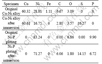 From Table 4, we see that the main elements of the original Ni-P plating are Ni, P, and O. After 30 d exposure in the SRB solution, the content of these elements decreased obviously and the element S appeared and reached to 14.15% in mass fraction. It means that the SRB also promoted the dissolution of the Ni-P plating. However, the lower potential of Ni-P plating may provide cathodic protection to the B30 copper-based alloy at first when exposed to the corrosive environment. After a period immersion, the corrosion products of Ni-P plating formed, and barrier type protection will therefore be offered by the plating. With increasing nickel consumption and corrosion product depositions, the base B30 alloy is protected with improved physical barrier.