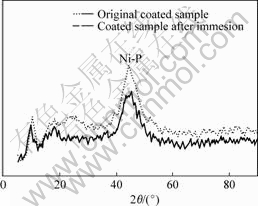 From Fig.5, we may see that there is no crystalline peak value presented in the XRD for the coated sample after 30 d immersion in the SRB solution. It suggests that the structure of the Ni-P plating still kept un-crystalline, and that the B30 Cu-Ni alloy under the Ni-P plating was not corroded for the structure of the base material is crystalline.
