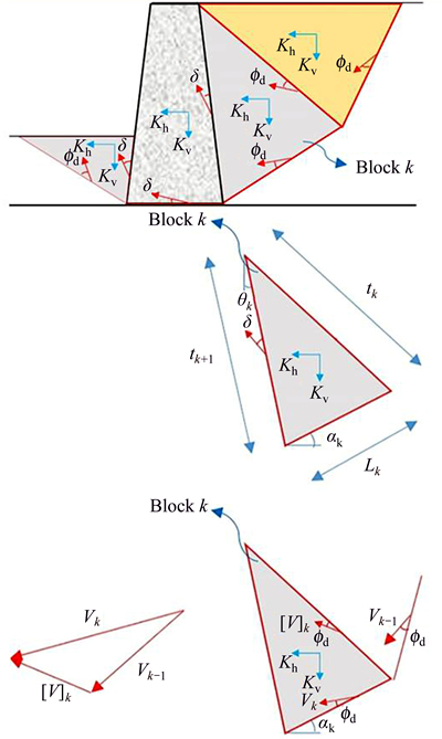 where αk and Gk are the angles of the failure line of the wedge k with respect to the horizontal and the weight of the wedge k, respectively. Now, equate the work by internal and external loads and substitute Cd and fd with C and f, in which Fs is obtained from Eq. (4) by trial and error. In this equation, f is the soil friction angle and f is the soil cohesion, also kv and kh are, respectively, vertical and horizontal earthquake acceleration coefficient.