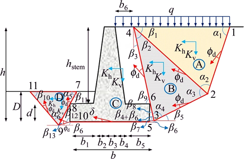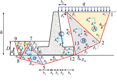 The four-block failure mechanism for determining sliding safety factor in the seismic state is presented in Figure 2.