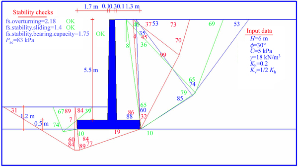 According to Figure 9, the critical failure wedges for determining the seismic active force of the wall are displayed in blue, the critical failure wedges for determining the sliding safety factor of the wall are displayed in green and the critical failure wedges for determining the deep shear failure of the wall are shown in red. The optimal dimensions obtained in this study are presented in Table 9 along with the those obtained by the common wall design method (limit equilibrium). FSr is the sliding safety factor; FSt is the overturning safety factor; Fsbc is the safety factor deep shear failure.