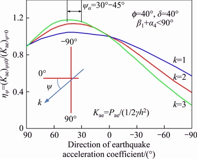 In this equation, (Kae)ψ=0 represents the value of seismic active force coefficient when the earthquake acceleration coefficient (k) has a horizontal orientation. Changing the direction of earthquake with respect to horizon will change the value of ηψ. Critical direction of the earthquake acceleration (ψcr) is defined as the direction that maximizes the value of ηψ.