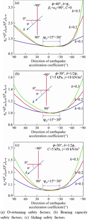 In 1990, CHEN et al [29] determined the critical direction of the earthquake acceleration coefficient. They attempted to determine the earthquake acceleration direction that maximizes the active force exerted on the wall. Nevertheless, the goal of maximizing the force is to minimize the safety factor for wall stability. Therefore, in this study, the critical direction of the earthquake acceleration coefficient is assumed to maximize the active force and minimize the stability safety factors. The resultant acceleration of earthquake is defined according to Eq. (37):