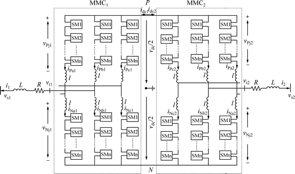 理论上,各子模块构成的桥臂电压均可等效成1个可控电压源vPjk和vNjk(j为a,b和c,表示三相;k为1和2,分别对应MMC1和MMC2系统)[15];下标P表示上桥臂;下标N表示下桥臂;iPjk和iNjk为相应桥臂电流。