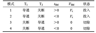 从图3可知:每个功率单元都是两端元件,通过2个开关器件T1和T2的作用;VSM可以实现在电容电压Vc与0之间的切换,从而调整桥臂输出电平的个数。子模块4种常用的工作状态如表1所示。
