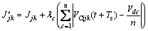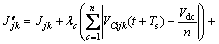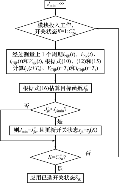 式中:ijk ref为参考电流,它根据预先设定传递到交流系统的有功和无功功率求得。在理想情况下,若交流侧电流跟踪参考值,目标函数Jjk达到其最小值0,则这种情况被作为交流侧电流控制的理想状态。在每个采样期间,Jjk为MMC所有可能的开关状态计算并比较,从而得到式(11)的最小值,作为下一个开关周期最佳的开关状态。