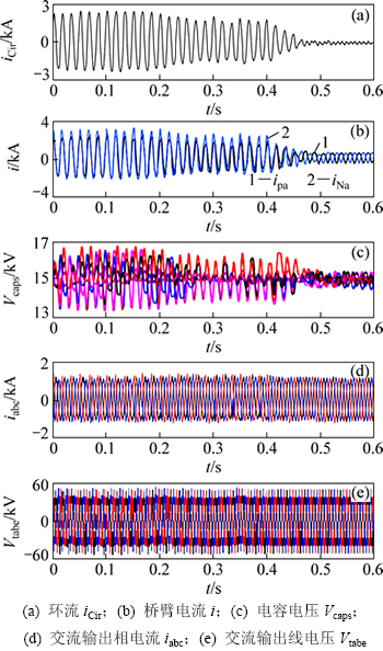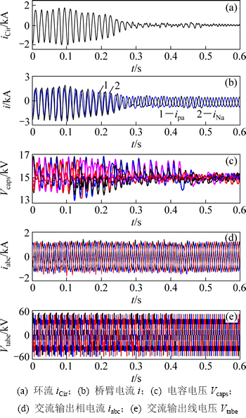 )。在t为0.1 s和 0.4 s时,开启MMC单元的环流抑制功能(系数