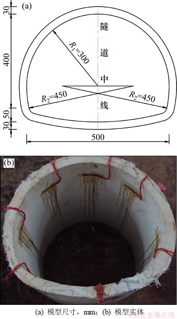 根据依托工程衬砌断面及相似比,得到模型尺寸如图1(a)所示。按试验确定的配合比拌合均匀,浇注至预先准备好的高精度钢模中,使之成型,如图1(b)所示。所有试验均在自行设计的试验箱内进行,试验箱长×宽×高为3.5 m×3.0 m×2.0 m。为减小边界效益影响,在试验箱的内表面设置了1.2 cm厚钢化玻璃。