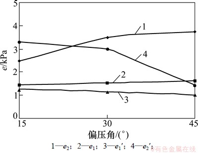 图6所示为水平压力e终值随偏压角的变化曲线,符合意义见图5。分析图6可知: