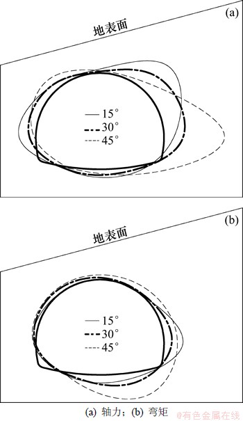 (3) 当偏压角为15°~30°时,内力分布的不对称性增加较平缓,偏压作用相对不明显;当偏压角从30°增大到45°时,左右典型位置不对称性增加较快,说明当偏压角达到30°以上时,地形偏压对隧道衬砌受力状态的影响非常显著。