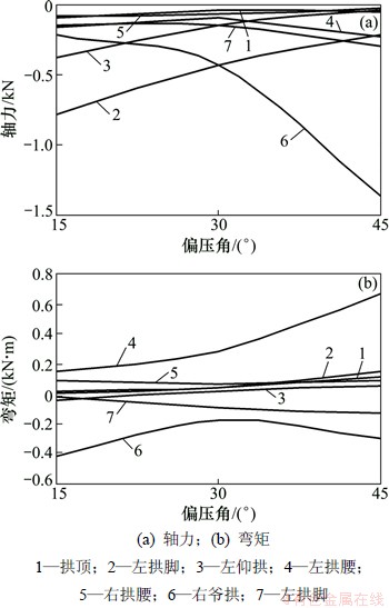 图8所示为偏压条件下衬砌内力终值分布情况;图9所示为各测点处截面内力随偏压角的变化曲线图。分析图8和图9可知: