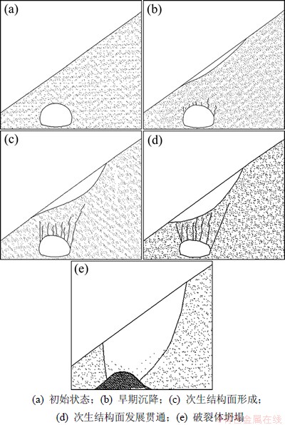 (5) 围岩自承能力基本丧失,结构承担的荷载将由松动荷载转变为全土柱荷载,量值迅速增大,整体结构将被压屈,变形急剧增大,上覆岩土体产生大面积滑动,最终形成坍塌,如图10(e)所示。