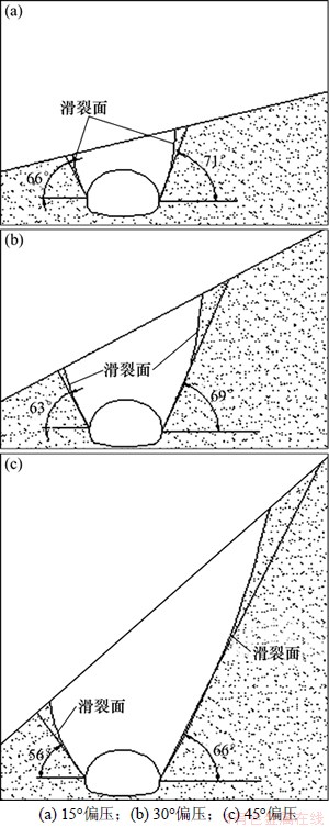 (1) 围岩的破坏形态由一空间滑裂面组成,形成以隧道为顶、边仰坡线为底的倒锥形体。破坏范围受偏压角度影响,当偏压角度较小时,破裂范围越小,破裂深度浅,塌落量小;反之,破裂范围宽,深度深,塌落量大。