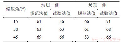 试验值均小于“规范法”计算值;当偏压角较大时,大于“规范法”计算值;而深埋侧与之相反。这进一步说明了“规范法”低估了荷载的偏压特性。