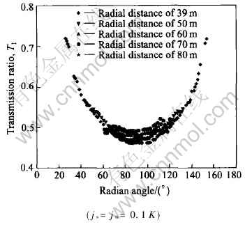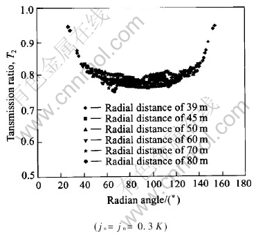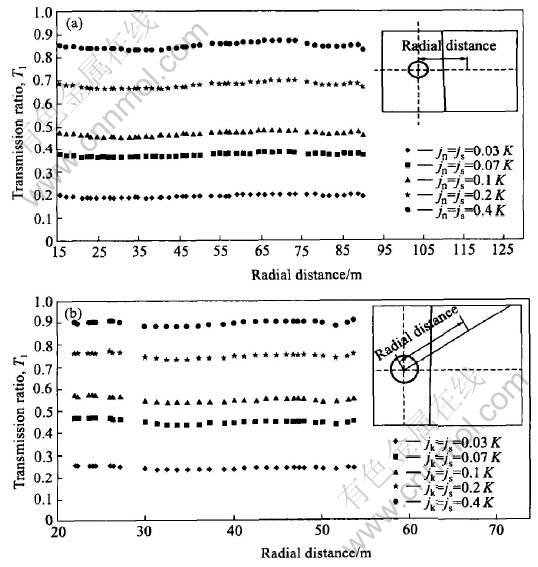 Fig.2 Transmission ratio T1 along two lines with α of 90°(a) and 49°(b)