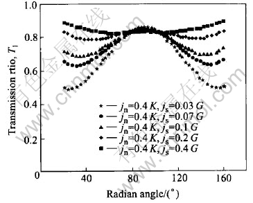 Several lines with different α are chosen. The results show that the transmission ratio at any point on a line with the same α is independent of the radial distance from the center of wave source. The transmission ratio at any point along a line with the same α is related to the stiffness of the joint, and the higher the stiffness value, the bigger the transmission ratio. For example, Fig.2 shows the transmission ratio along lines, with α of 90°(a) and 49°(b).