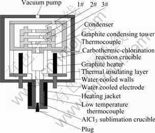 Alumina (15 g) and graphite (6 g) as starting materials were mixed on a molar ratio of 1?4 of Al2O3to C with addition of 10% TiO2. They were then made into pieces of d 20 mm × 5 mm under pressure of 2-6 MPa. The pieces and AlCl3 were put in different graphite crucibles (shown in Fig. 1). The heating rate of the system was about 20 K/min. In the alumina carbothermic reduction process, the system needs to be kept at 993, 1 193, 1 393, 1 493, 1 593, 1 713 and 1 763 K for 30 min, respectively. Afterward, AlCl3 sublimated at 373-403 K and was transported to the carbothermic reduction slag for 40-90 min, then chlorination process started. At high temperature, AlCl(g) was produced and moved into upper condensing towers. Meanwhile, AlCl(g) decomposed into AlCl3(g) and Al(l) at low temperature. The schematic diagram of vacuum furnace is shown in Fig. 1.