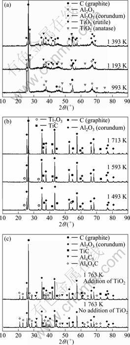 In Fig. 2(b), graphite and α-Al2O3 remain unchanged at 1 493-1 713 K. Ti2O3 and TiC are generated, while rutile disappears at 1 493 K. The intensity of TiC increases with increasing temperature from 1 493 to 1 713 K. Ti2O3 reduces and disappears gradually. Only Ti2O3 and TiC are detected while other intermediates fail to be detected, according to Ref. [8], because the reactions of these intermediate products may be too fast, and the interval of temperature range of experimental research is too broad and other factors.