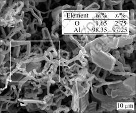 Figure 7 shows the SEM image and EDS analysis of condensates obtained from 1# condensing tower. The product aluminum has a filar structure. As shown in the EDS image, it is obvious that the contents of aluminum and oxygen in condensates are 98.35% and 1.65% (mass fraction), respectively. The titanium-containing compound is not detected in the condensate, which indicates that it is not involved in the subhalide decomposition process.