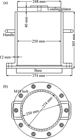 The test system for the compaction properties of these backfill materials is shown in Fig. 3. A YAS-5000 electro-hydraulic servo-pressure test machine produced by Changchun Kexin Test Instrument Co., Ltd, China was used. The maximum axial force provided by the test machine was 5 MN. Besides, the compaction device was a self-designed steel cylinder with inner diameter, outer diameter, and height of 125 mm, 137 mm, and 305 mm, respectively. The loading platen installed with this compaction device was adopted to bear load from the test machine, while the loading platen had a radius of 124 mm and a height of 40 mm (see Fig. 4).