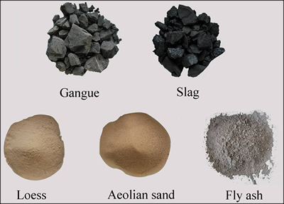 Five types of test material were involved: gangue, fly ash, loess, aeolian sand, and slag as shown in Fig. 5. These are respectively selected from coal gangue piles, a loess slope, an opencast slag discharge field, and the discharge point for fly ash from the nearby power plant. To meet the demands of solid backfill mining, gangue and slag had to be crushed to a grain size of less than 50 mm. Then the samples were prepared according to the broken grain-size grade, while the samples of fly ash, loess, and aeolian sand were prepared according to their original sizes. After sample preparation, each backfill material sample was put into the compaction device and then subjected to an imposed axial stress of 8 MPa. Each set of tests was performed for three times.
