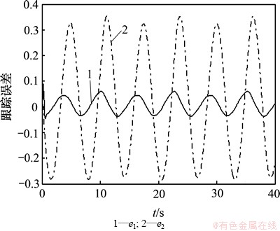 由图2和图3可知:在控制器1和控制器2作用下,系统(47)输出均能够实现对xd的稳定跟踪,y1和xd基本重合,y2和xd则有较大误差,即跟踪误差e1明显小于e2,同时,跟踪误差有限时间内收敛到零点的一个有限邻域内。