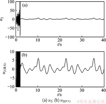 由图4和图5可知:对于2个控制器的控制信号而言,u 1平滑无抖振,而u2在开始出现剧烈抖振,经过约2.1 s才进入无抖振状态,且控制信号幅值大于u1。