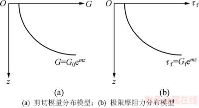 1) 视桩身为理想弹性体,桩周土为非均质地基,即假定桩侧地基土剪切模量G和桩侧极限摩阻力τf随深度均按下式呈指数函数模式增加(见图1):