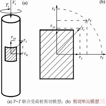 在桩顶V-T联合作用下,假定深度z处桩周土体对桩身的剪切力τz可分解为竖向侧摩阻力τvz与环向切应力τtz(如图2所示),且满足