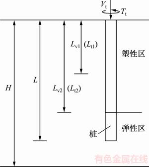 当加载顺序变为T→V时,桩顶受到较大扭矩Tt且桩周土已部分处于塑性状态(相应桩-土临界滑移点距桩顶Lt1)后,再施加竖向力Vt,则临界滑移点从Lt1继续向下发展至Lt2处(见图4),该截面竖向力与沉降表示为Ve和ue。同理可求得桩侧土体剪切应力为