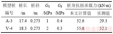 由表2可知:由本文解答求得的桩身扭矩承载力均略高于模型试验值。其原因主要在于假定的式(1)模型难以完全符合文献[16]中模型桩的桩周土质条件,此外,一些其他复杂试验条件也不能予以考虑。