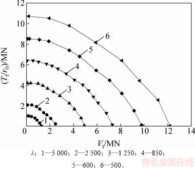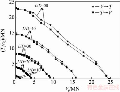 同样,从弹塑性到弹塑性阶段,对V→T和T→V这2种加载顺序,随着2种荷载组合(Vt,Tt)的增加,临界滑动点由Lv1(Lt1)处发展至桩底,桩周土全处于塑性阶段,此时,对应的Tt(Vt)即为桩在承受一定竖向力Vt(扭矩Tt)下所能承受的极限扭矩(竖向力),不同(Vt,Tt)即可构成承载力包络线。