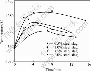 Fig.3 Curves of temperature change against time with steel slag as additive agent
