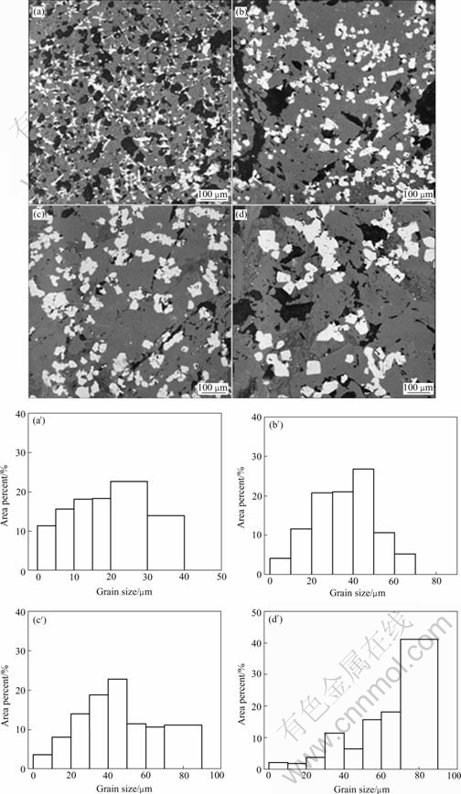 Fig.4 shows the morphology of slag samples and corresponding grains distributions of perovskite phase. It can be clearly seen through the morphology that the perovskite grains of the treated slag are much bigger than that of the original slag. The area percent of perovskite phase in original slag is 13.9%, whose average grain size is larger than 30 ?m, but 63.6%, 74.6% and 92.5% in the treated slag respectively.