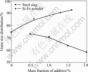 Fig.5 shows the relationship between the content of additive agents and the area percent of perovskite phase that grains are beyond 30 ?m. This figure shows clearly that with the increase of steel slag, the grains size of perovskite phase decreases, while grains size of perovskite phase increases with the increase of Si-Fe powder.