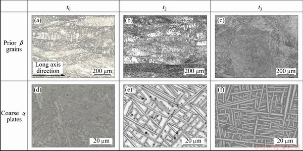 Treatment 5 is also called triple heat treatment. The specimens did not suffer deformation. Figure 8 shows the microstructure of TC21 alloy at different time during triple heat treatment. As can be seen in Figs. 8(a), (b) and (c), the coarse equiaxed β grains with diameter about 400 μm formed after the first annealing (at t1) and had little change during subsequent annealing. After the first annealing at 970 °C (10 °C above the transus), nothing can be found in prior β grains (Fig. 8(d)). After the second annealing was conducted at 900 °C for 1 h, there were coarse α plates forming in prior β grains (Fig. 8(e)). During the third annealing, the secondary α platelets would precipitate as mentioned above.