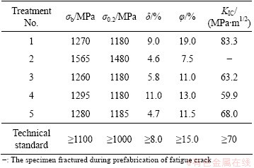 The room temperature mechanical properties of TC21 titanium alloy after different heat treatments are shown in Table 3. As can be seen in Table 3, both of ultimate strength and yield strength of all specimens after different heat treatments are high. The highest ultimate strength and yield strength, reaching 1565 MPa and 1480 MPa, respectively, are obtained after treatment 2, but at the same time it owns the lowest elongation, reduction of area and fracture toughness. TC21 alloy reveals weak plasticity and fracture toughness, and only the specimens after treatment 1 can satisfy the technical standards. According to the above results, the better comprehensive mechanical properties of TC21 alloy can be obtained after treatment 1.