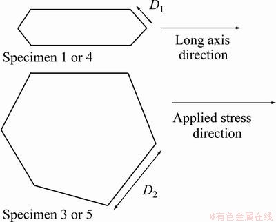 According to the microstructures in Figs. 3, 5-8 and the height and diameter of prior β grains in Table 3, it can be found that the plasticity of TC21 alloy is affected by prior β grains. In specimens 1 and 4, prior β grains exhibit pan-like shape, and TC21 alloy has better tensile plasticity in L direction (Fig. 3(a)) of prior β grains. In specimens 3 and 5, prior β grains are equiaxed, and the plasticity of TC21 alloy is lower than that in specimen 1 or 4. SAUER and LUTJERING [16] showed similar results. This phenomenon can be explained by the effective slip length parallel to the grain boundary α layers, which is thought as a soft zone. The maximum resolved shear stress has an angle about 45° with respect to the applied stress, so the distance marked D1 in Fig. 11 represents the effective slip length in the L direction in specimens 1 and 4, while D2 represents the effective slip length in specimens 3 and 5. From Table 4, it is obviously that D1 is smaller than D2. The increase of effective slip length makes the crack form easily, and drops the plasticity of metal materials. So the plasticity of specimen 1 or 4 is better than that of specimen 3 or 5.