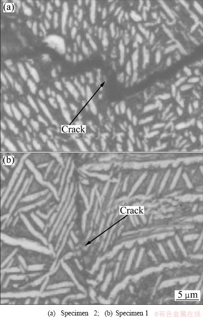 According to Tables 3 and 4, specimen 1 with crisscross coarse α plates has high fracture toughness, while specimens 2 and 4 with individual ones have low values. The α phase is generally considered tough phase [12]. Once the crack forms in the alloy, it will propagate under the action of imposed stress. The coarse α plates are individual in specimen 2 or 4, and the crack almost propagates along the residual β matrix, and seldom passes through α plates (Fig. 12(a)). However, in specimen 1, coarse α plates are crisscross each other, so the crack cannot avoid to meeting α plates during propagation (Fig. 12(b)). Then a plastic deformation zone in α phase, which will form nearby the crack tip, is bigger than that in β matrix [18]. The plastic deformation zone will consume some plastic deformation work, which will impede the crack to propagate. So, crisscross α plates are helpful to enhance the fracture toughness of titanium alloy compared with individual α plates.