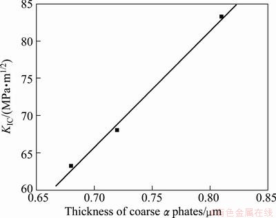 The thickness of coarse α plates is another factor affecting fracture toughness of titanium alloy. As can be seen in Fig. 13, the fracture toughness increases with thickness increase of coarse α plates, and the similar results have been reported by many researchers [19-21]. This is because with the thickness increase of the coarse α plates, the size of the plastic deformation zone increases, the stress intensity required to cause crack propagation becomes greater, the crack propagation will be restrained, and finally the fracture toughness of TC21 alloy increases [21].