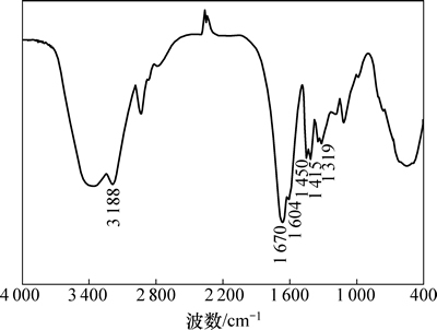 从图1可见:强峰(3 188,1 670和1 604 cm-1处)分别归属于官能团—CONH2中的υs(NH2),υs(C=O)和δs(NH2),中等强度峰(1 450和1 415 cm-1处)分别归属于官能团—CONH2中的δ(CH2)和δ(C—N—H),强度较弱的峰(1 319 cm-1处)归属于官能团—CONH2中的υ(C—N),这表明该聚合物为非离子型聚丙烯酰胺目标产物[18]。对于非离子型聚丙烯酰胺,要使其具有异羟肟酸基和羧酸基官能团,必须进行水解和羟肟化改性。羟肟化反应和水解反应都会放出氨气,当通氮气时,可以将反应产物带出体系,利于反应进行,同时羟胺在无氧条件下更加稳定,避免了不必要的分解。但高温下的水溶液反应由于蒸发使得聚合物越来越黏稠,不利于体系稳定,通气量过快会加剧这种情况,因此,应控制通气速度在合理范围内,并采取冷凝措施,使蒸发水及时返回反应体系。