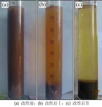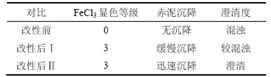由于羟胺与—CONH2反应活性相比于—COO-的反应活性更强,因此,先将非离子型聚丙烯酰胺羟肟化,再水解。初步实验方法为:通过水溶液聚合得到聚丙烯酰胺水溶胶后,加入羟胺碱溶液,调整温度,反应一段时间后,再加入一定量氢氧化钠溶液;调整温度,继续反应一段时间,取出产物样品,进行后续处理和测试。按此方案改性前后样品的FeCl3显色情况及对进口铝土矿增浓溶出赤泥的分离沉降效果如表3和图3所示。