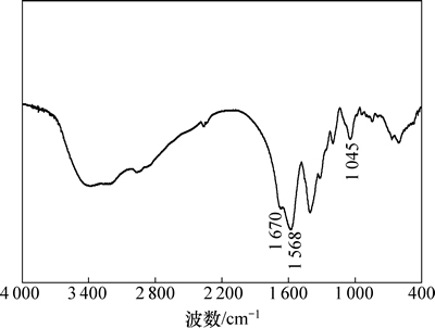 红外光谱图中,1 670 cm-1处的峰为酰胺基中C=O的特征吸收峰,1 568 cm-1处—COO-的特征吸收峰较强,说明合成产物为具有较大水解度的阴离子聚丙烯酰胺;1 045 cm-1处有1个较明显的吸收峰,为—NHO—的特征吸收峰,表明产物有一定的羟肟化度。由此可知:聚丙烯酰胺水溶胶经过羟肟化及水解改性后含有酰胺基、羧酸根及氧肟酸基团,为目标产物氧肟酸型阴离子聚丙烯酰胺。
