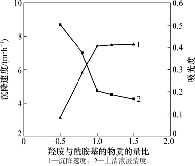 羟胺与酰胺基的物质的量比为0.5~1.5,考察盐酸羟胺用量对改性的影响。改性聚合物对进口铝土矿增浓溶出赤泥的分离沉降结果如图5所示。