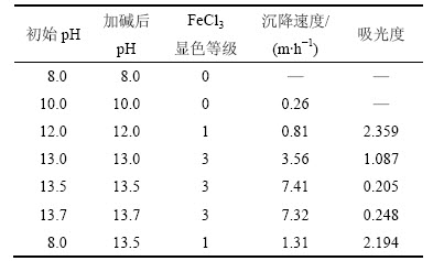 用氢氧化钠溶液调整羟胺溶液的初始pH,控制羟胺用量与酰胺的物质的量比为1:1,于60 ℃下反应3 h,于85 ℃下反应2 h,考察pH及后加碱对改性过程的影响。其对进口铝土矿增浓溶出赤泥的分离沉降效果如表4所示。